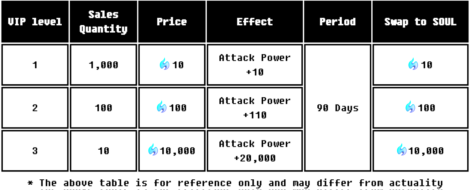 Users will be categorized into VIP1 to VIP3 based on the amount of SOUL token they own, and each table gets a different drop rate for rare materials required for crafting items. This is a sort of staking system but it rewards users with a higher drop rate for rare materials instead of providing tokens by how long they have deposited the coins.